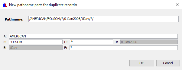4. For multiple records, pathname parts that are the same for all records will show up in the dialog. Where parts differ (such as having pathnames with C parts of FLOW and ELEVATION), the part will be displayed with an asterisk *.