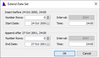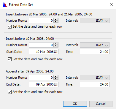 3. For irregular interval time series data, you have the option to Insert between the selected dates, Insert before the first date, and Append after the last date. Regular interval data can only have data inserted before and after the existing time steps. Each choice requires you to enter the number of rows that will be added. From the Number Rows list, enter or select the number of rows that will be added to the table at the given area.