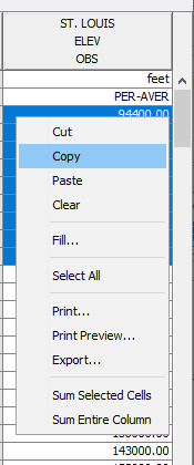 The Cut command removes data from the cell and places it on the computers clipboard in ASCII format. For regular-interval time series data, the Cut command will set the emptied cell to the missing data flag.