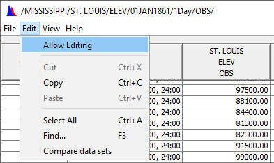 In HEC-DSSVue, you can edit data directly in tables, but first you must set the table to allow editing. From a tabulate dialog box select the Edit menu, click Allow Editing. This will set the table editable and allow you to manually edit the listed data. When this option is checked, the background of non-editable table cells display grey and the Cut, Paste, Insert Rows, and Delete Rows commands become available from the Edit menu.