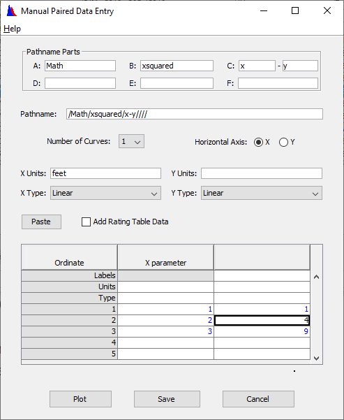 1. From the Data Entry menu, click Manual Paired Data. The Manual Paired Data Entry dialog box dialog box will open: