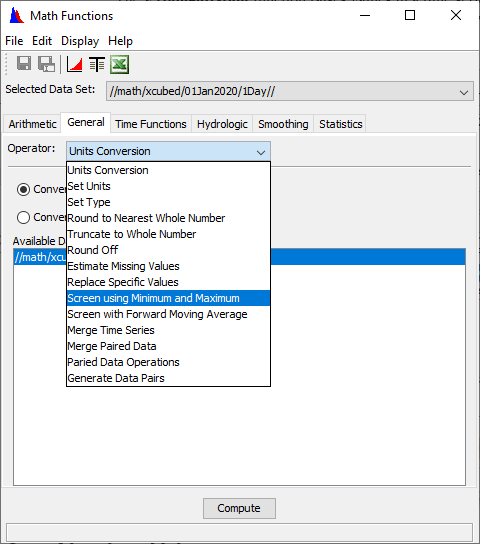 Minimum, Screen Using Forward Moving Average, Merge Time Series, Merge Paired Data, and Generate Data Pairs.