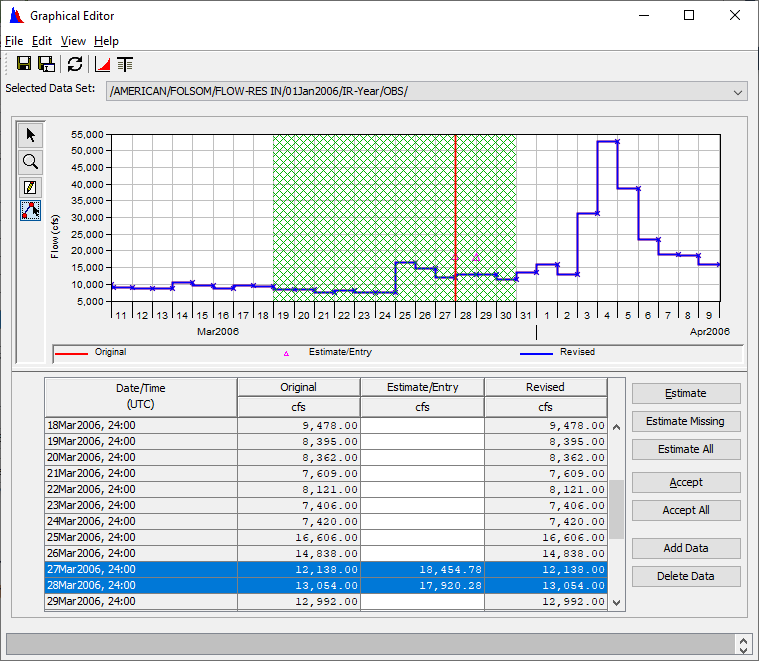 5. When complete, press the Accept button or the Accept All button to accept all edits. This will copy the data from the Estimate/Entry column into the Revised column and will be ready to save to the HEC-DSS file.