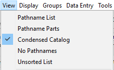 | View | The View menu allows you to customize the display of HEC-DSS pathnames, refresh the catalog and search pathnames. Available commands are Pathname List, Pathname Parts, Condensed Catalog, No Pathnames, Unsorted List, Search pathnames by string, Search pathnames by parts, and Refresh Catalog. |