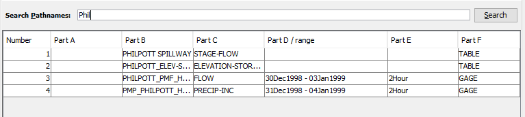 To search and display all pathnames containing a specific text, from the View menu click Search pathnames by string. Then type the text into the Search Pathnames box and click Search. The pathnames in the file that contain the text will be displayed in the DSS Pathname table.