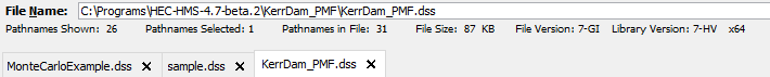 Multiple DSS files can be opened and viewed in HEC-DSSVue at the same time (below). Each time you open a new dss file, a tab is created with the name of the dss file shown on it. The pathnames