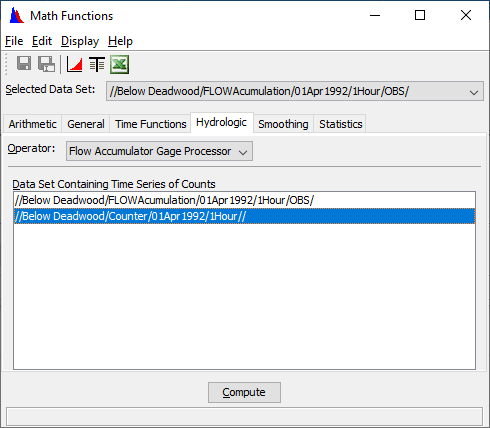 1. Choose the Hydrologic tab of the Math Functions screen and select the Flow Accumulator Gage Processor operator, as shown below.