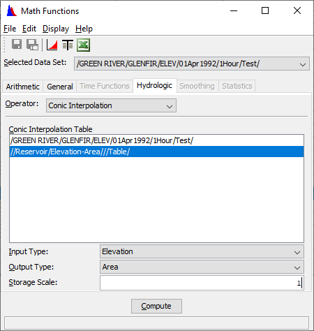 The Conic Interpolation function can interpolate a time series of elevation to derive a time series of storage or area. The function can interpolate a time series of storage to derive a time series of elevation or area. If the output time series is elevation, the output units are assigned from the x-units of the paired data set. If the output time series is area, the output units are assigned from the y-units of the paired data set. If the output time series is storage, the output units are undefined.