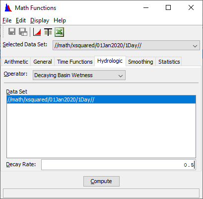 1. Choose the Hydrologic tab of the Math Functions screen and select the Decaying Basin Wetness operator, as shown below.