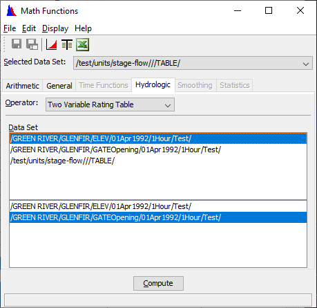 1. Choose the Hydrologic tab of the Math Functions screen and select the Two Variable Rating Table operator.