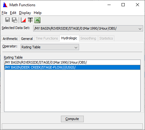 1. Choose the Hydrologic tab of the Math Functions screen and select the Rating Table operator, as shown below.