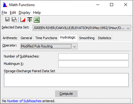 1. Choose the Hydrologic tab of the Math Functions screen and select the Modified Puls Routing operator, as shown below.