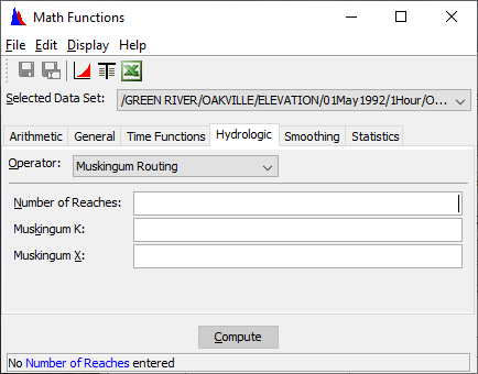 1. Choose the Hydrologic tab of the Math Functions screen and select the Muskingum Routing operator, as shown below.