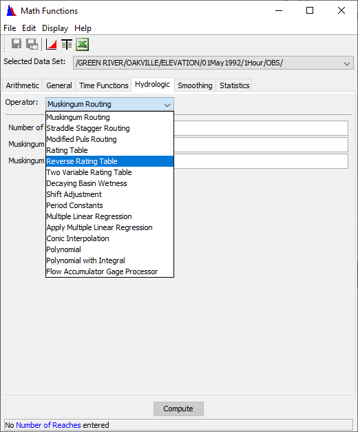 1. Choose the Hydrologic tab of the Math Functions screen and select the Reverse Rating Table operator, as shown below.