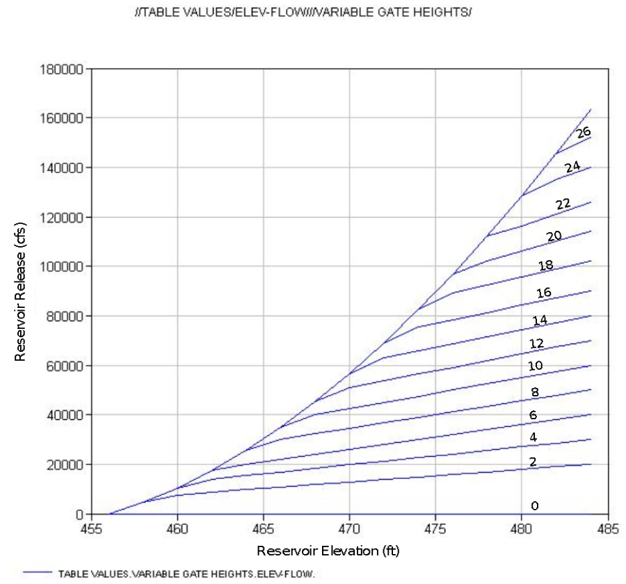 Example of two variable rating table paired data, reservoir release as a function of reservoir elevation and gate opening height (curve labels).