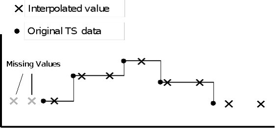 If times in the new time series precede the first data point in the primary time series, the value for these times is set to missing. If times in the new time series occur after the last data point in the primary time series, the value for these times is set to the value of the last point in the primary time series. Interpolation of values with the Period Constants function is shown below.