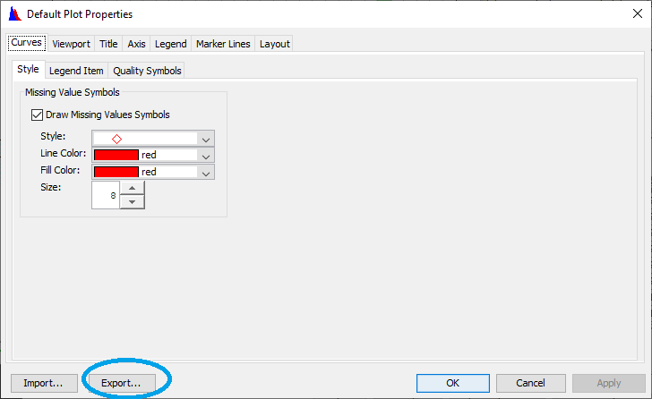 1. In a plot window from the Edit menu, click Default Plot Properties. In the Default Plot Properties dialog box, click Export.