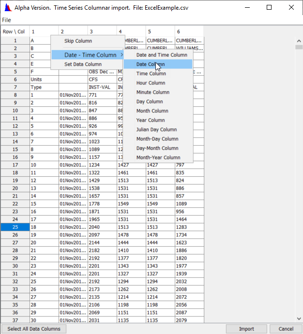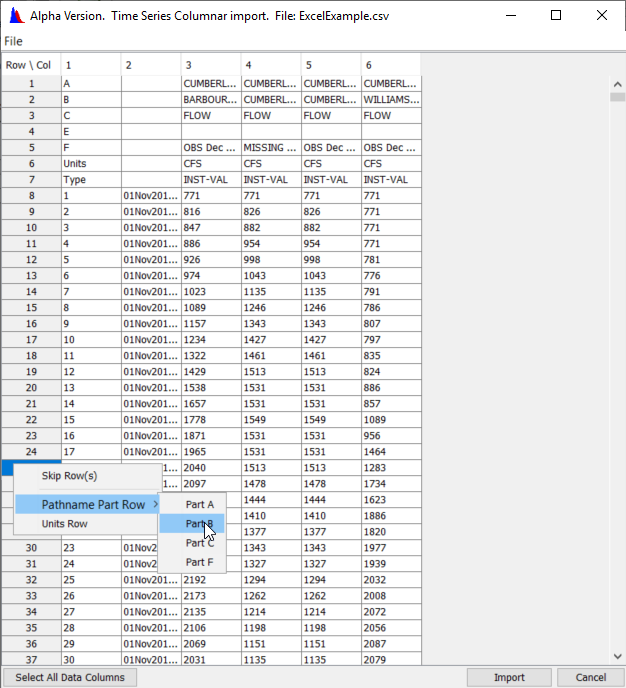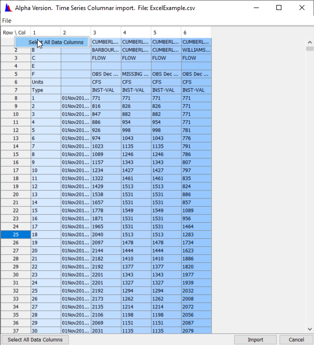 5.Select any location, parameter, units, or version, etc. rows by right clicking on the header row in the first column and selecting the item, as shown below. You may also skip any rows that are not to be imported or used.