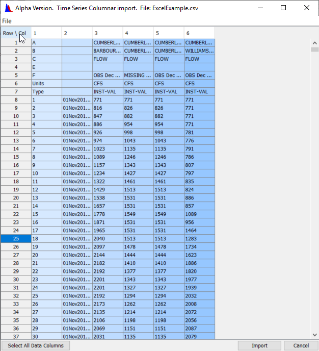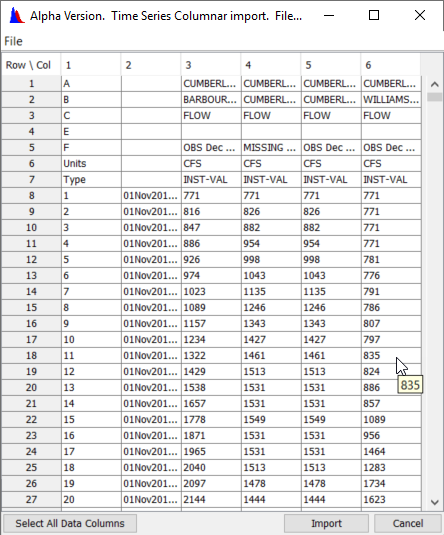 3.Select your file to import. Data should be in columns, separated by comma or spaces. Ideally, a row should contain a location or parameter, and a column should contain date/time.