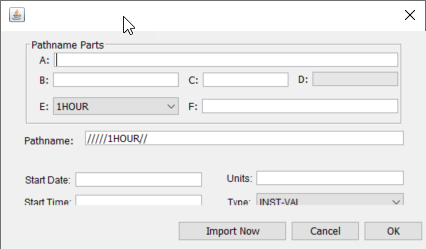 You can import time-series data from Excel, a ".csv" file, or a blank separated file using the Data Entry dialog box. At this time, you can only import time-series data (both regular interval and irregular interval data). Check the HEC-DSSVue plug-ins web page for updates.