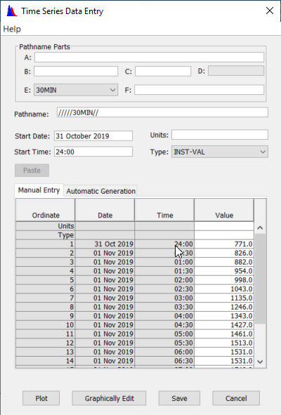 7.Enter the pathname parts, units and type, and then press Save. An example of the Time Series Data Entry window that appears after data have been imported is shown below.