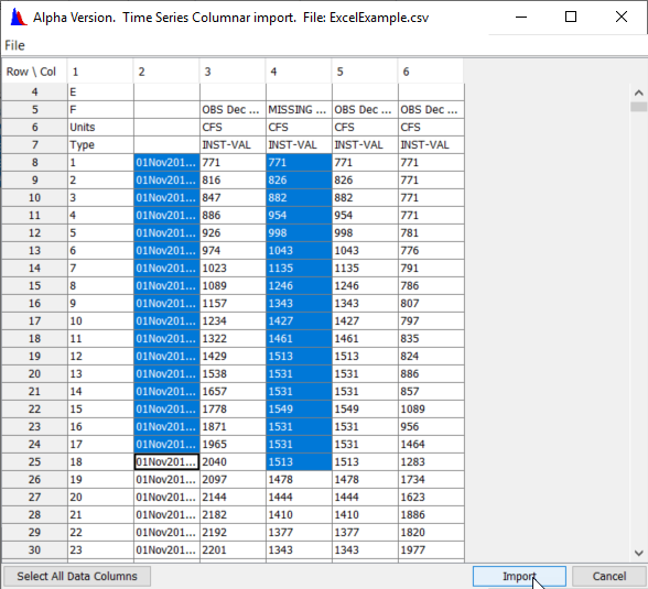 5.For regular-interval time series data, select the column cells that you wish to import. For irregular-interval data, you need to select date/time column cells also.