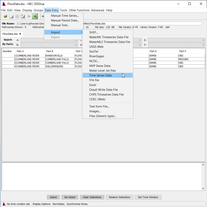 1.From the HEC-DSSVue main window open a DSS file, from the Data Entry menu, point to Import, click Excel (below).
