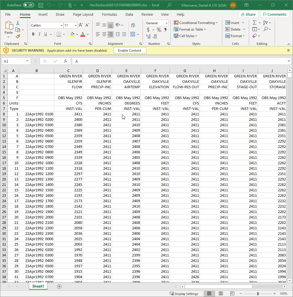 Note: You can only change data in Excel when you are editing - you cannot add or delete data. The data must remain in the same format with the same number of rows and columns to be stored back to HEC-DSS.