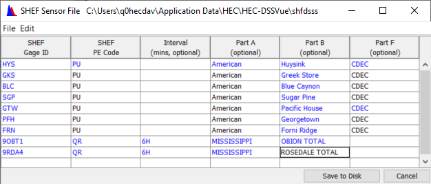 | Sensor | relates SHEF physical element (PE) codes to DSS parameters (C part) |