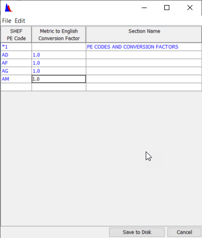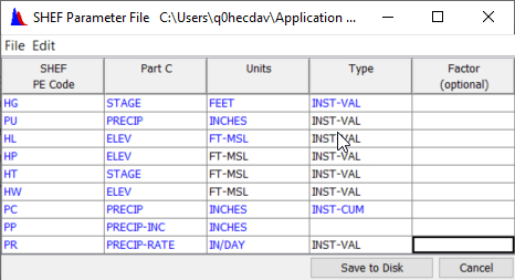 The SHEFPARM file contains SHEF PE (Physical Element) codes and the metric - English conversion factor. Generally, the supplied file should be sufficient unless newer PE codes are being used. To edit the SHEFPARM file, from the Options dialog box, with the SHEF tab clicked (above), click Edit that is next to the ShefParm File box. A dialog box will open (below), which will allow the user to edit the SHEFPARM file. In this table, the first column contains the PE code and the second column contains the Metric to English conversion factor, if there is no factor, set this cell to 1.0.