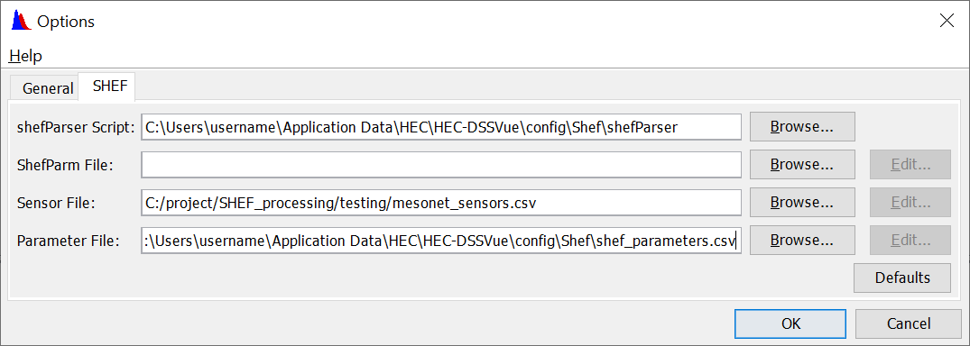 The SHEF sample table files are distributed with HEC-DSSVue and stored in the users application directory under HEC-DSSVue (the location of the application directory is dependent on the operating system). You can browse to these files and edit the files, from the Advanced menu, click Program Options, the Options dialog box will open (below). Click the SHEF tab, information from the dialog box will show the location of the SHEF sample table files. If you have existing files from SHFDSS, you can use those in HEC-DSSVue.