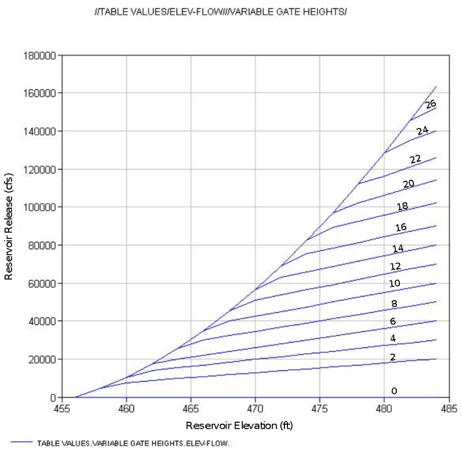 Example of two variable rating table paired data, reservoir release as a function of reservoir elevation and gate opening height (curve labels)