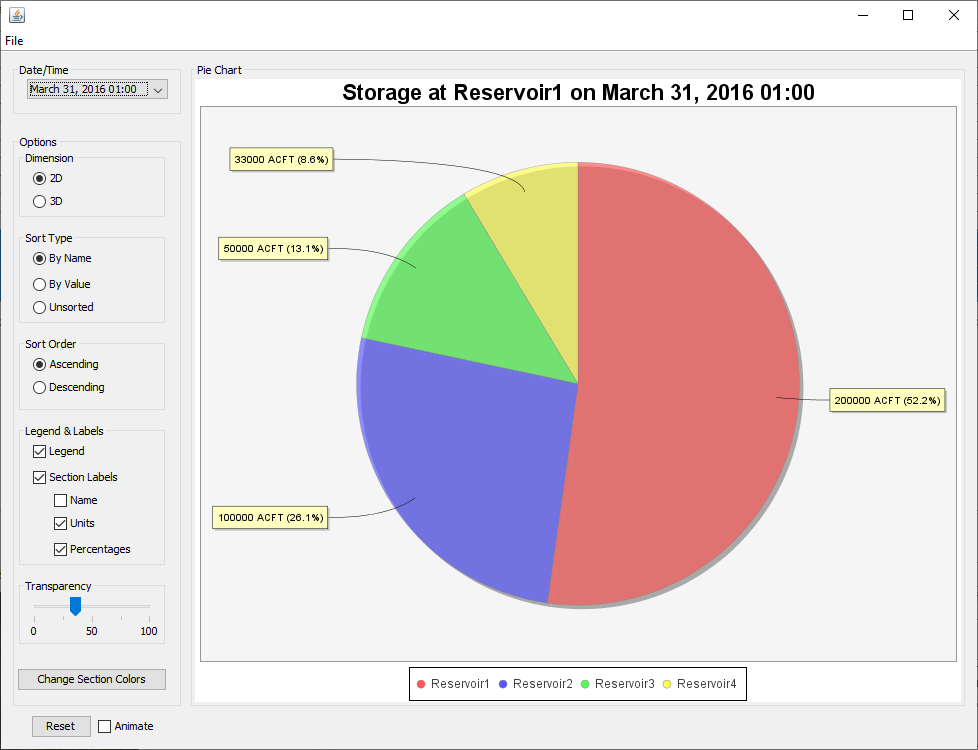 The Pie Chart plug-in for HEC-DSSVue allows you to plot a pie chart of any value of interest (e.g., flow, stage, or reservoir storage) for a single date and time at multiple locations. Either a two-dimensional (2D) or three-dimensional (3D) plot can be created. The pie chart is plotted using a default color sequence, but you can change the color of each individual slice. The transparency of the chart can also be adjusted. By default, all sections are labeled with the site name, units, and percentage of the total. The unit and percent labels can be individually turned off, or section labels can be turned off altogether. A legend is created below the chart by default, which can also be turned off. The section labels and legend are updated dynamically. The final product can be printed, or it can be saved to a graphics file to be included in presentations, documents, or web pages.