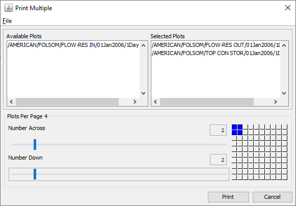 Finally, the Print Multiple command allows you to print several plots on one page. The Print Multiple dialog box (below) shows all of the currently open plots in the Available Plots box. To select plots for printing, double-click on the plots in the Available Plots box and the selected plots will move to the Selected Plots box. Next, use the slider bars to specify the number of plots you wish to appear horizontally and vertically on the page. The grid to the right of the sliders reflects your choices.