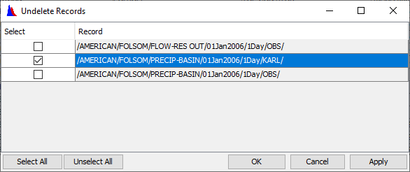 5. Check the boxes next to the records that you want to undelete, or click Select All to undelete all records in the list. You can unselect the checked records by clicking Unselect All. Once you have made your selection, click OK to undelete those records and close the dialog. Alternatively, you can click Apply to undelete the records and leave the dialog box open. A confirmation message will appear stating that the records have been undeleted.