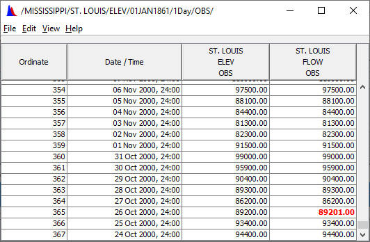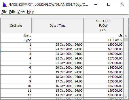 An example table produced using HEC-DSSVue is shown below. Tables allow you to view and edit HEC-DSS data in a vertical scrolling window that shows the ordinate (starting from the start date/time), the date and time stamp, and the values for the selected data sets. From the File menu of a table dialog box. You can view the tabular data in plot format by clicking Plot. Respectively, you can tabulate data displayed in a plot dialog box, from the File menu, click Tabulate.