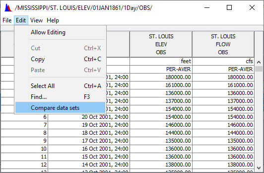 If you tabulate two or more similar time series data sets, you can compare values from both sets from the table. From a tabulate dialog box (see below), use the Edit menu, and click Compare data sets.