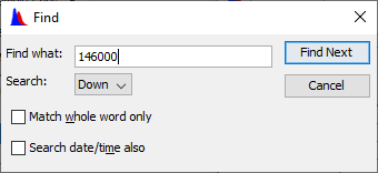 In the Find what box (see below, enter the item that you are searching for in your dataset. When you click Find Next, the next value that matches will be highlighted. You can search up from where your cursor is, or search down. You have the option of searching for the exact number or part of that number. You can also search for a date or time.