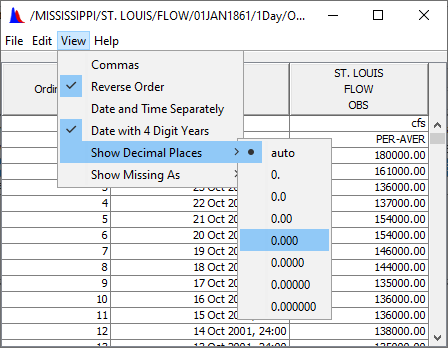 From a tabular data dialog box, from the View menu, you can choose to display commas in numbers by clicking Commas. You can reverse the order of the table by clicking Reverse Order. For time series data, this option will show the latest values first. The date and time of the data can be tabulated in separate columns by clicking Date and Time Separately. To have the dates display the years with four digits, click Date With 4 Digit Years. You can set the precision of decimal places for your data by pointing to Show Decimal Places and then clicking the number of decimal places you wish to display (see below).