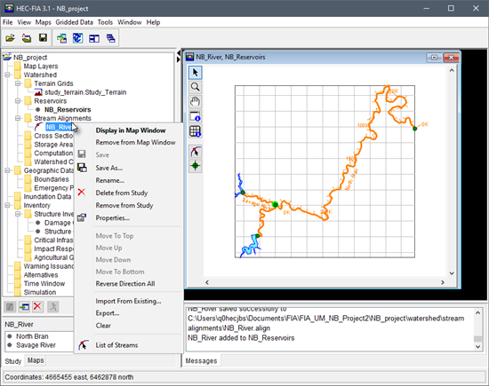 In HEC-FIA a stream alignment is optional and is typically used when evaluating consequences by common computation points in CWMS (Corps Water Management System) or the HEC-WAT (Watershed Analysis Tool) software. Stream alignments used by HEC-FIA could possibly be developed in an HEC-ResSim (Reservoir System Simulation) model, or an HEC-RAS (River Analysis System) model.