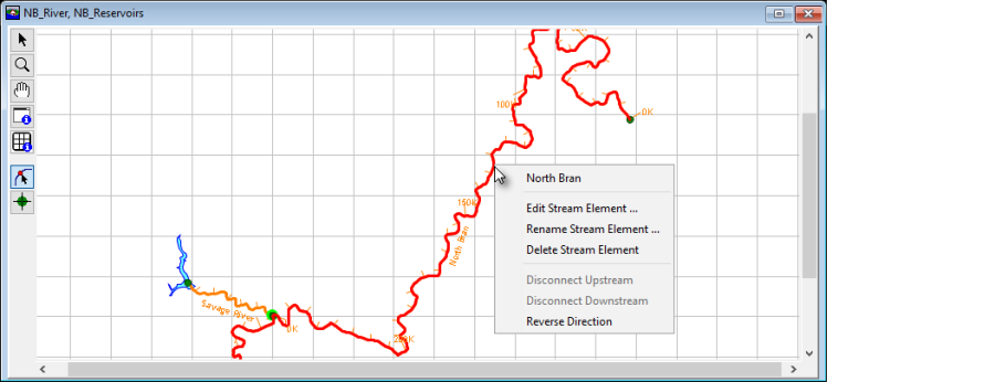 . Using the Stream Alignment Tool a user can add stream segments to a stream alignment, and by right-clicking on a stream segment access the map window stream alignment shortcut menu. From the shortcut menu, a user can delete, rename, reverse the direction, disconnect the upstream or downstream ends, and edit stream segments.