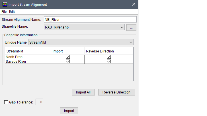 - By default, HEC-FIA assumes the downstream end of the river is at the beginning of each line segment, which is the first vertex point when the line shapefile was drawn. If the default assumption is not correct for the selected shapefile (i.e., RAS_River.shp) and the stream segments were drawn from the upstream end of the river to the downstream end, then the user can reverse the direction of the stream segment. Check the Reverse Direction checkbox for the incorrect stream segment (drawn from the upstream direction to the downstream direction) to import the stream alignment correctly.