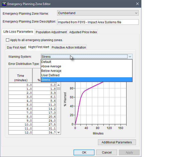 Note: For EPZs imported from FSYS impact areas, the warning systems list contains the warning system function defined for the FSYS impact area (e.g., Sirens in Figure 6.9) in addition to Default, Above Average, Below Average, and User Defined.