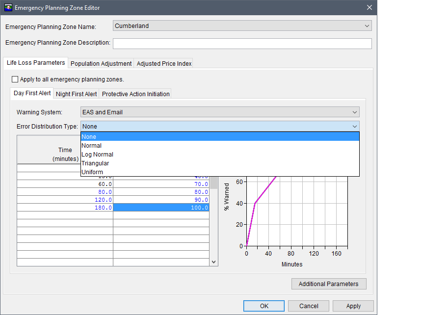 Life loss parameters are defined for an existing emergency planning zones set. Warning systems and mobilization functions can be defined independently for each zone. User-defined warning systems (day and/or night first alert) and mobilization functions (protective action initiation) can be defined, which allow the user to enter the most representative function values for an EPZ (common procedure when the user conducts an expert elicitation with the local Emergency Management Agency).