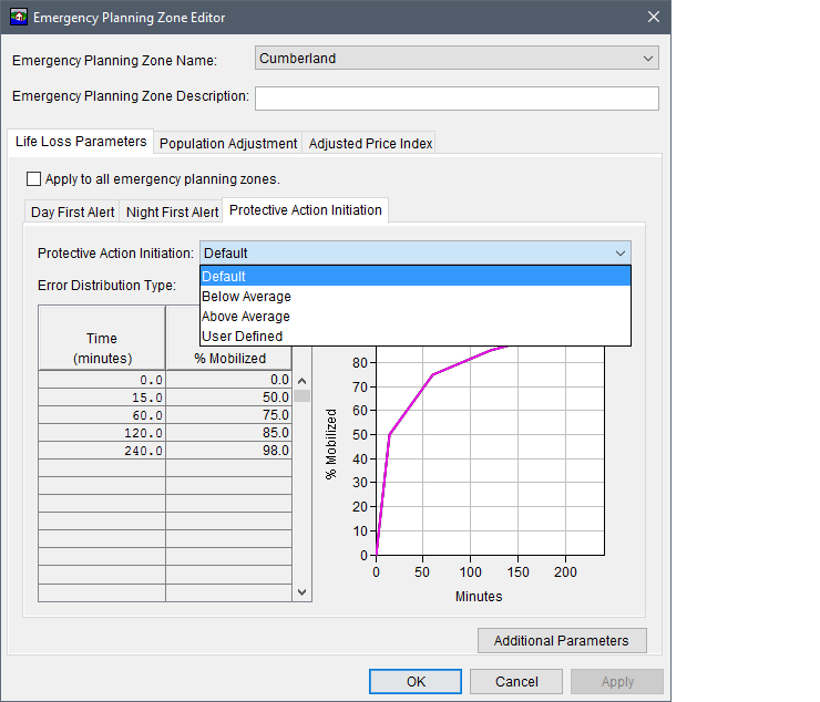 - To define protective action initiation (PAI) mobilization information for the life loss calculations, select the Protective Action Initiation tab. From the Protective Action Initiation list, select the mobilization function (from the list provided: Default, Above Average, Below Average, and User Defined) that is applicable to the community(s) in the selected emergency planning zone. A PAI mobilization curve defines the amount of time it takes after an individual(s) receives a warning to the moment when the individual(s) leaves their home. For a typical reconnaissance study, Default functions might be used, but a Default function is a major source of uncertainty.