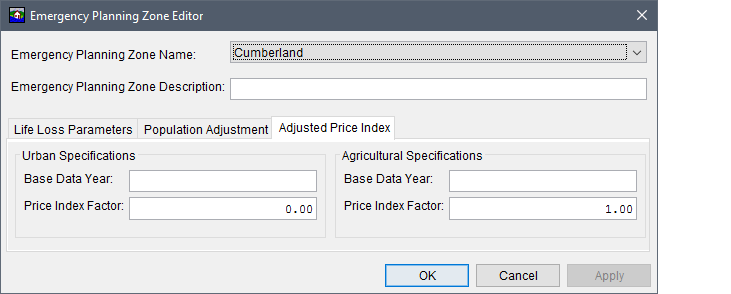 - From the Emergency Planning Zone Name, select the zone of interest. To adjust the urban price index, from the Urban Speficiations box, in the Base Data Year box enter a year that represents the price index factor. In the Price Index Factor box enter the price index factor.