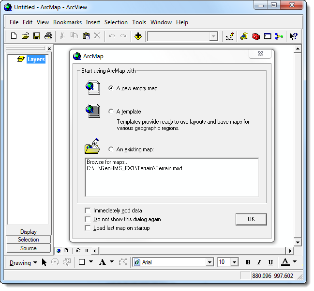 Start ArcMap. The ArcMap window opens. By default, a new empty map is selected, click OK.