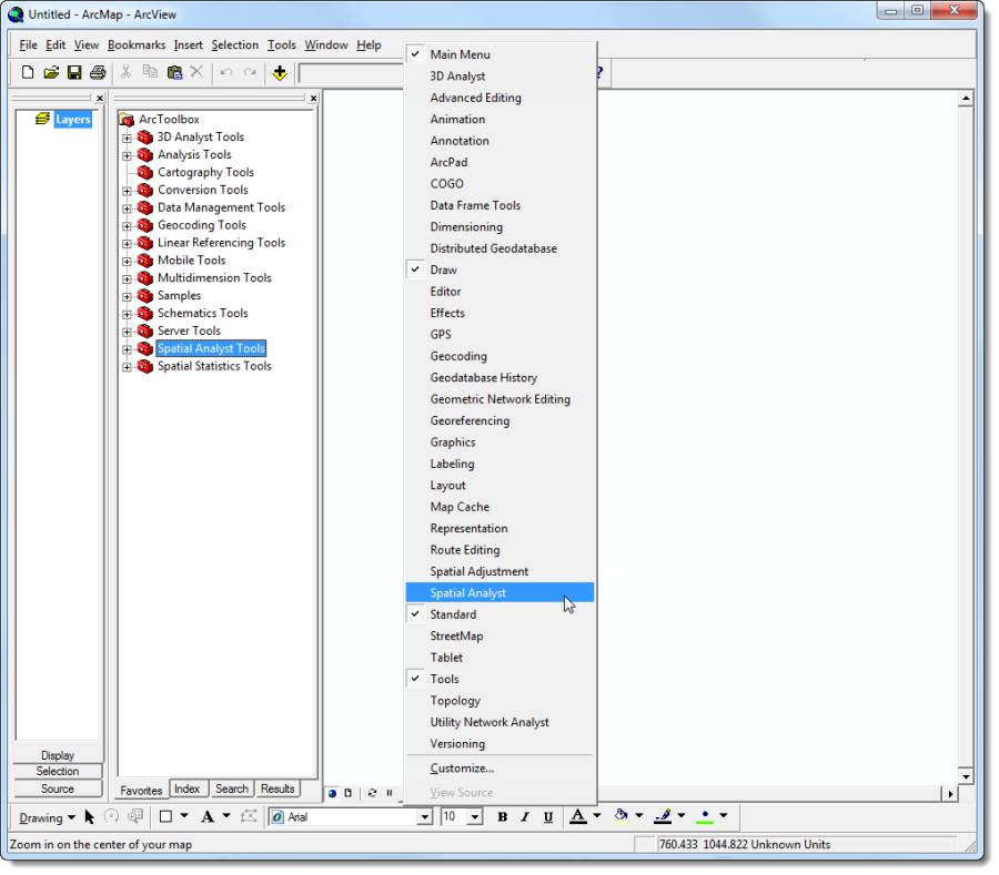 - If the Spatial Analyst Toolbar is not available from the ArcMap window, right-click on the empty area next to the Menu Bar. From the shortcut menu, click Spatial Analyst, the Spatial Analyst Toolbar appears in the ArcMap window in the toolbar area.
