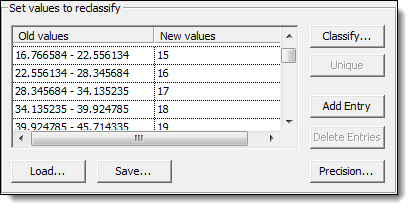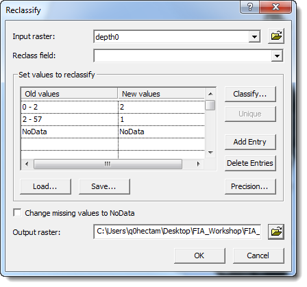 Default values appear in the Set values to reclassify box. These values (both old and new) need to be reset. Set all values less than or equal to two (2) feet to a new value of two (2) and values from two (2) feet up to the highest value in the depth grid to a new value of one (1). For an example, see the figure below. Note that when entering the old value range a space is required on both sides of the dash (enter 0 - 2, not 0-2).