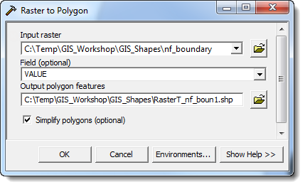- The input raster file is the hazard area boundary grid that was created in the previous section. Select the location of the hazard area boundary grid by clicking next to the Input raster box